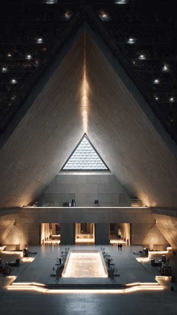 The museum's exterior is a stunning blend of modern architecture and ancient Egyptian design. The alabaster façade features hieroglyphic carvings, and the pyramid-shaped entrance is a nod to the nearby Pyramids of Giza. The colossal statue of Ramses II greets visitors at the entrance.